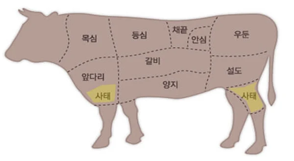 • 사태: 장조림이나 육회, 국으로 많이 먹으며 운동량이 많은 부위로 쫄깃하며 특유의 풍미가 좋습니다.